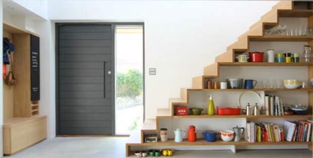 Эти лестницы принадлежат Дому G компании Архитекторов и Урбанистам, в котором некрасивое здание получает полное перевоплощение. Ступени лестницы становятся частью настенных полок, они служат и как уникальные книжные хранилища, и как установки для кухонных принадлежностей.